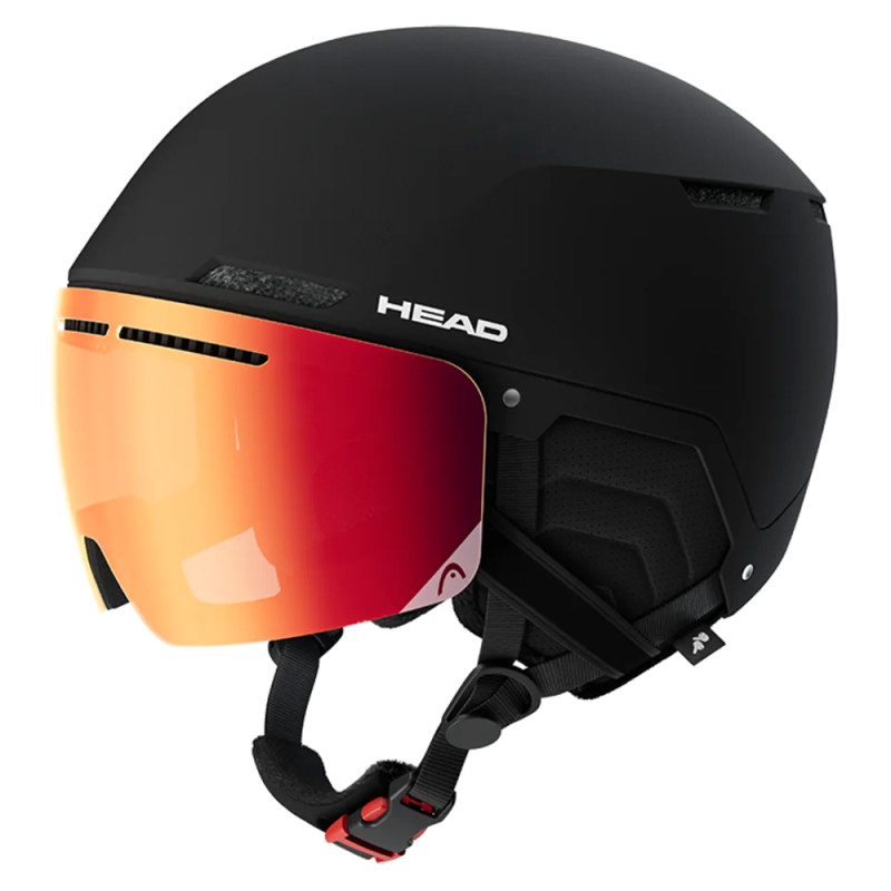 La struttura della visiera HEAD crea uno scudo protettivo contro raggi UV e vento e permette agli sciatori di indossare gli occhiali da vista. Come su un casco da motocicletta, la visiera può essere abbassata per proteggere gli occhi mentre si scia.