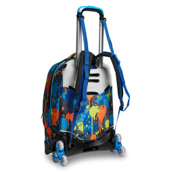 Ciao! Sono il nuovo Trolley Jack-3WD, dotato di sistema a 3 ruote per agevolare la salita dei gradini. Colorato e multiuso, in poche semplici mosse da trolley divento zaino e viceversa. Il mio carrello ha fondo rinforzato e protezioni angolari per dare stabilità al trolley e protezione al contenuto. Lo sganci e divento uno zaino lavabile, maxi capiente, dotato di tasca frontale e comodo da indossare grazie a schienale e spallacci imbottiti e rivestiti in tessuto. Spallacci che, se mi usi come trolley, possono essere a scomparsa o, grazie al CROSSOVER SYSTEM, sollevarsi automaticamente tirando su la resistente doppia barra telescopica con due regolazioni in altezza, evitando che i nastri striscino a terra.
