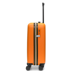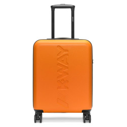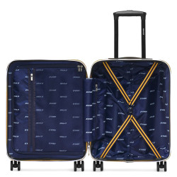 Trolley rigido da viaggio Cabin Trolley Small con maxi logo K-Way stampato sul davanti e dimensioni perfette per essere trasportato in cabina. L'accessorio presenta quattro ruote girevoli a 360°per la massima libertà di movimento, tre tasche con zip all'interno ed elastici incrociati multicolor. Chiusura con combinazione e TSA.