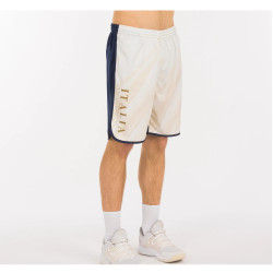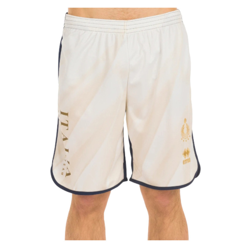 Puri, essenziali, iconici: i bermuda bianchi FIPAV x Erreà sono dedicati a chi vuole vivere lo sport con sincerità e passione. Il contrasto con il retro blu navy dona carattere al capo, esaltato da loghi oro e dalla scritta verticale ITALIA.